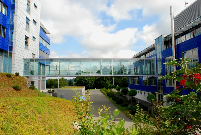 Stahl-Glas-Brücke verbindet das alte Gebäude des Auftraggebers mit einem